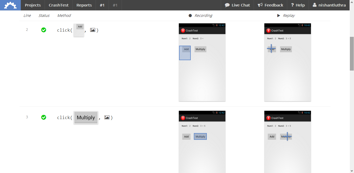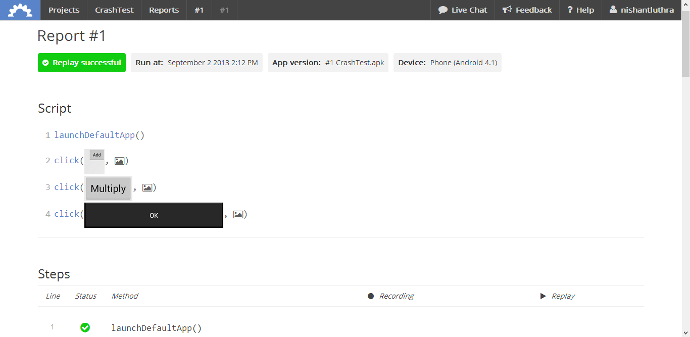 3. Detailed Report – In the report, all steps executed during replay are listed. For each step two screenshots are shown. The first screenshot had been taken during the recording and the second when the step was replayed. This allows you to easily compare how your app’s behavior has changed, for example, when running the test on a different Android version or on a newer version of your app.