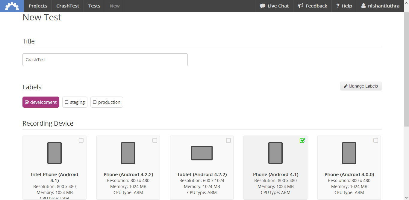 Name your test “CrashTest” and, if you like, select a label for it. Then choose a device to record your test on and click Continue.