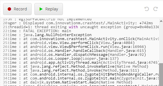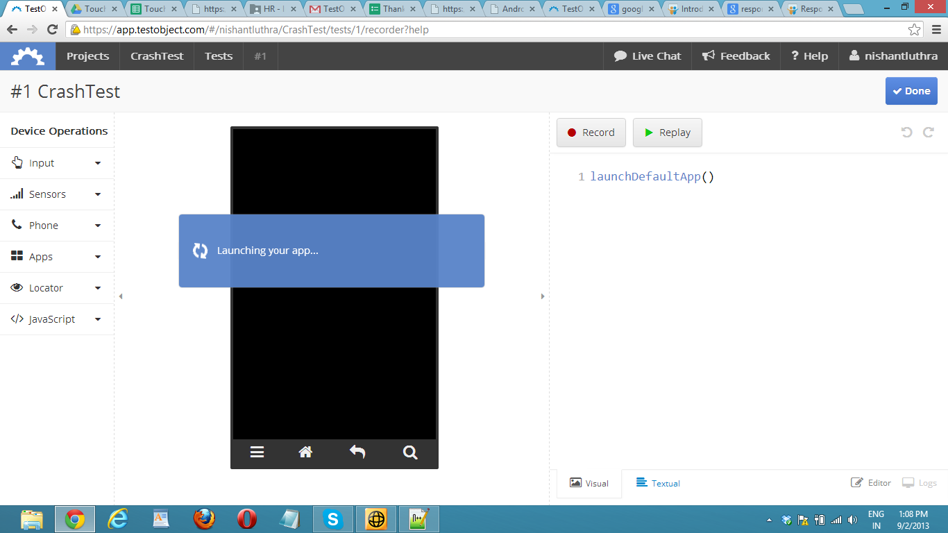 1. Record , Stop Record and Replay – Start the recording by hitting Start and Leave the recording mode by hitting Stop. You can now replay your test. To do so press the Play button. You will then get a fresh device so that the replay starts in a clean state. The editor, the device and the operations bar are locked during the replay. You can now follow the execution of your test.