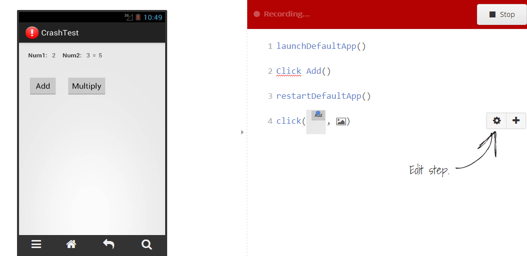As soon as your app has launched, you are ready to start recording. To do so click the Record button. Each action you execute on the device will now be added as a line in the script on the right side.
