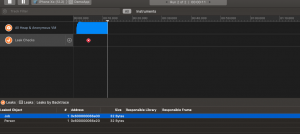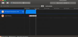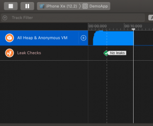 Now if we run the Instrument app then again record our app into it then we can see the green checkmark in place of the red cross. And its showing no leaks as well