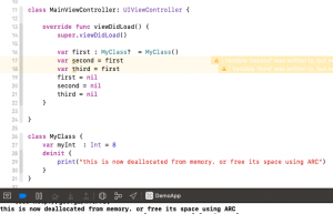 This is very simple viewController and a class named MyClass, in DidLoad just initiate the class and create a couple more variables to pointing to the same class and then set them all to nil. See the MyClass code there is a definite function in there this is called right before the object remove from memory. So there is three-pointer (three reference count for MyClass), once you nil-all of them then you can see the print statements.