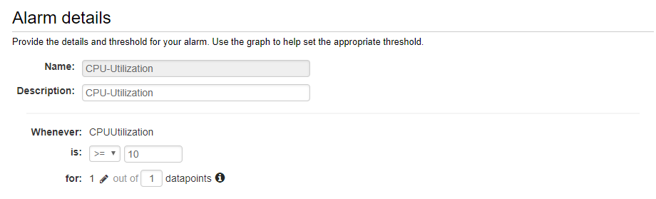 Now setup threshold or specify the alarm condition.is:, specify the metric is either greater than, less than, or equal to the threshold, So to specify the threshold value.for:, ALARM state to trigger the alarm. setup how many evaluation periods (data points) Data points are defined by the period set for a metric. For a “1 minute” period, there is one data point every minute. If you want the alarm to trigger on fluctuating data, set a smaller first number (M number).