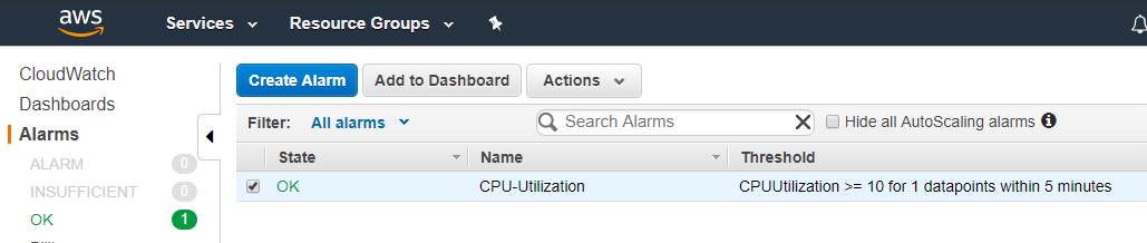 - Then click on Alarms from left navigation pane & click on create alarm.