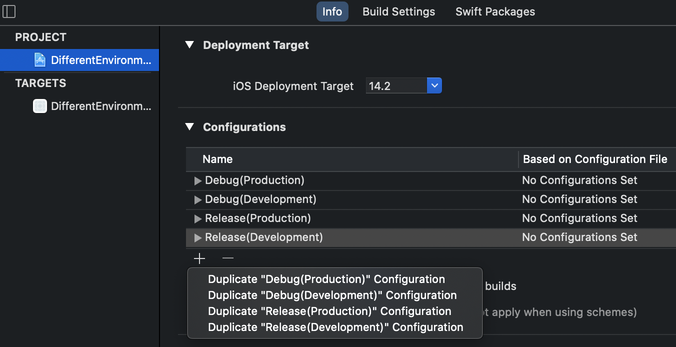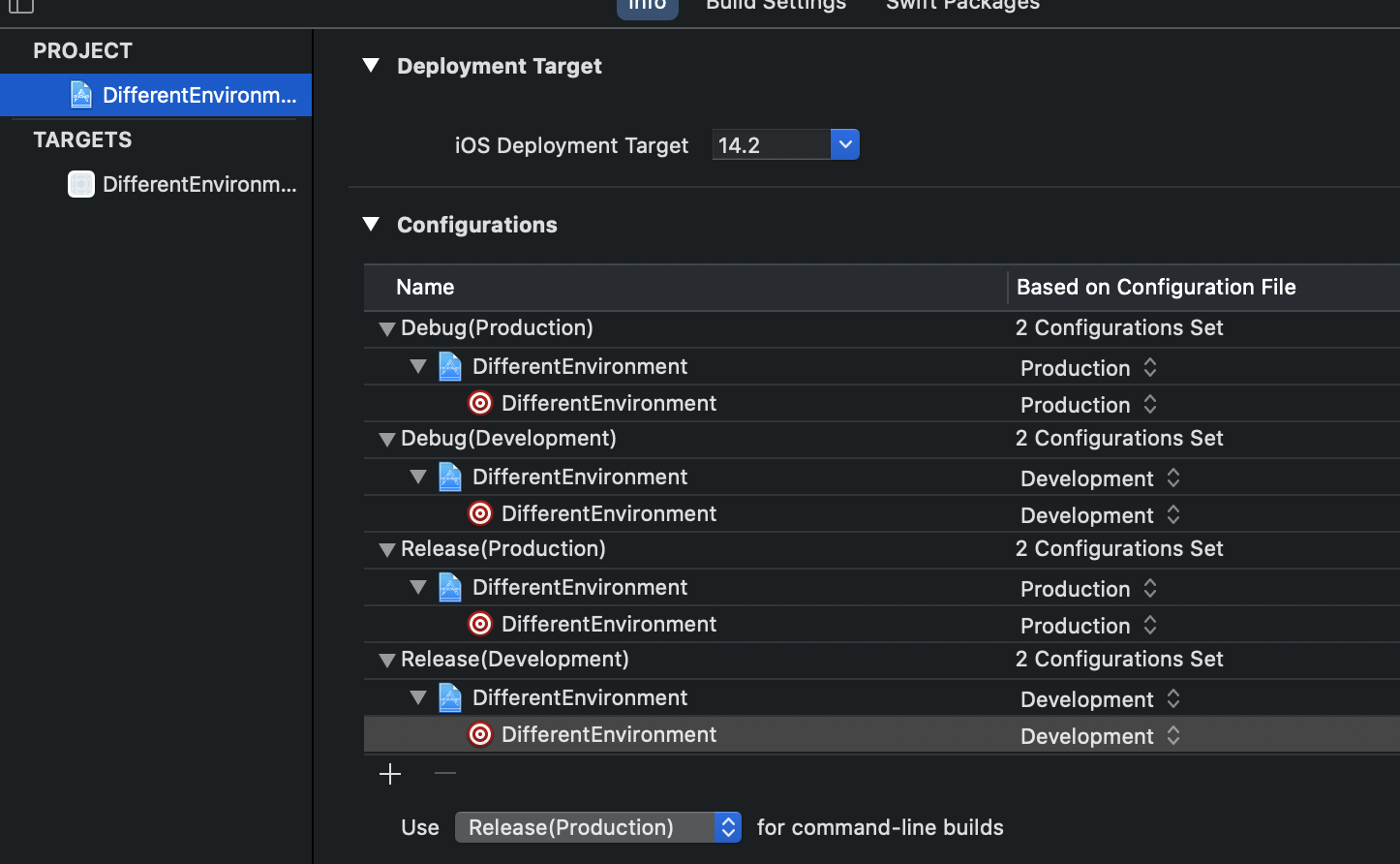 Step 2- Select the Project file( Top file ) in the navigator area, then select the Info tab and make sure your project is selected. Look at the configuration Section. Here, we already have Debug and Release configurations. So, for 2 environments, we have to build debug&release.