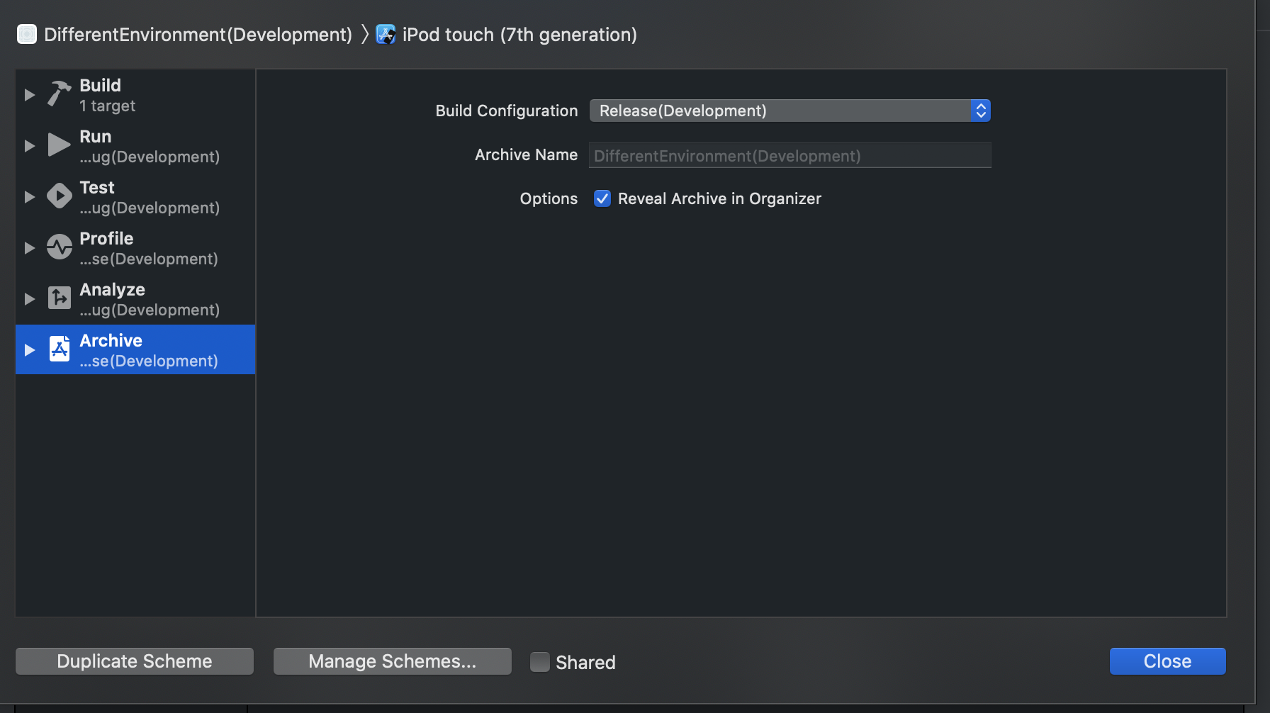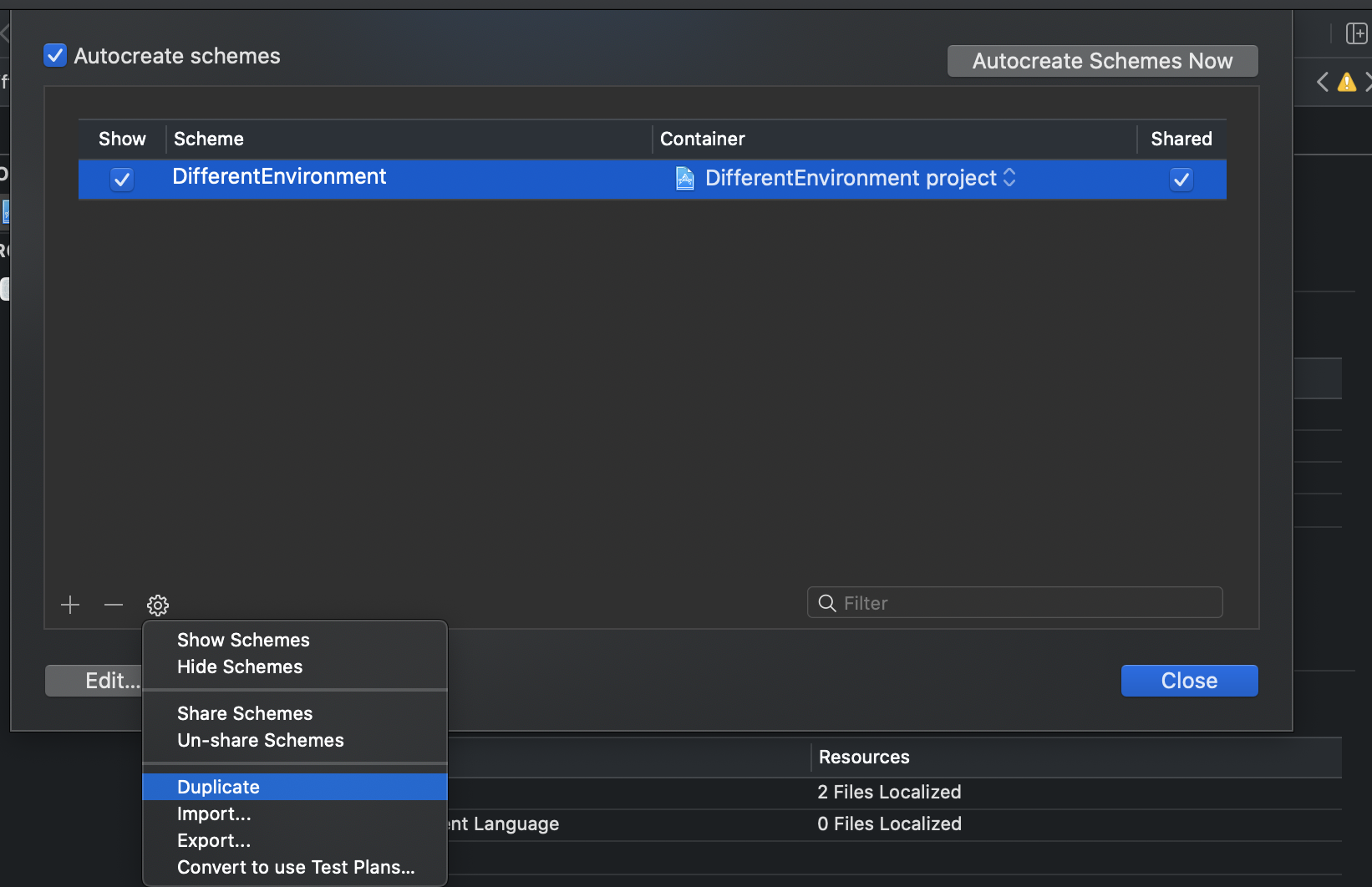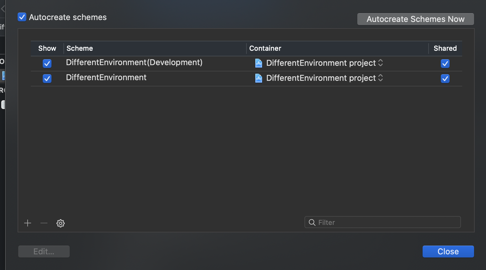 Now, make sure that our Default scheme uses the Production configurations(same as the previous step ) and make sure that all are marked as shared so that they are not strictly local to your own Xcode environment but also available project-wide if they are not checked by mistake then other openings this project can’t utilize this schemes, as shown in below image-