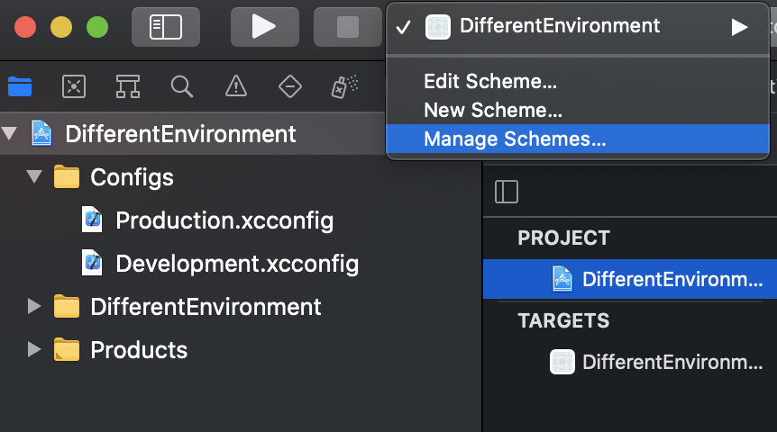 Step 5- Our Xcode Project also comes with a Default scheme named after the project. But, we have 2 Different environments so, we create another new scheme.