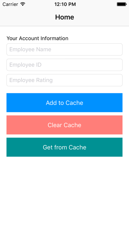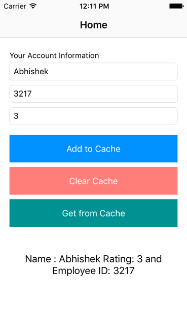 I assume you have enough skills to design a screen. So, there is a View Controller which list two Text Fields (which accepts Name and Account Number) along with three buttons (Add to Cache, Get From Cache and Clear Cache).