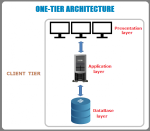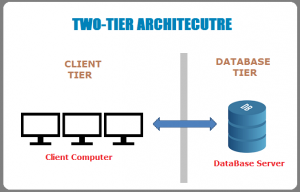 For instance, we have an application which is having only 2 layers. Examples are Excel files, MS word, etc. In order to work with these applications, users don’t need the internet. When the user opens the file and fills it with some data and saves it, it will be saved in a file system. It’s saved in the file system on a computer hard drive. So here there are only two components in the architecture namely client computer and file server which is nothing but a hard drive. Since the whole process takes place inside a single computer, it’s called 1-Tier architecture.
