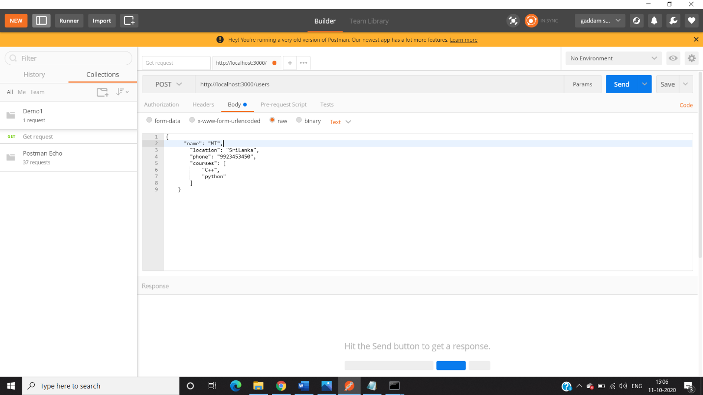 - In order to send the data using the POST option, click on Body option, choose the raw option and write the particular data inside the window provided.
