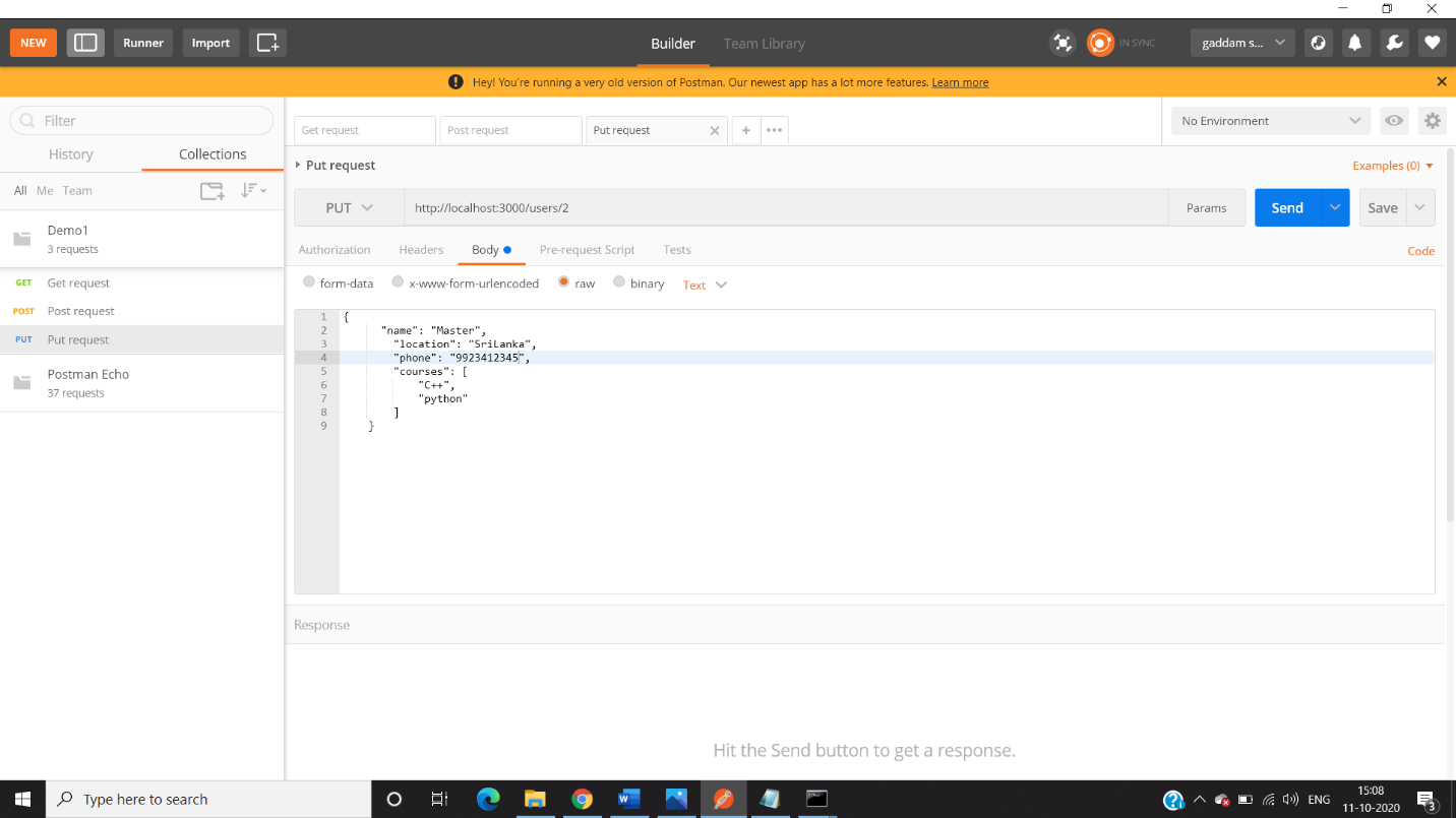 8. For POST and PUT options, we need to send the details inside the Body option.