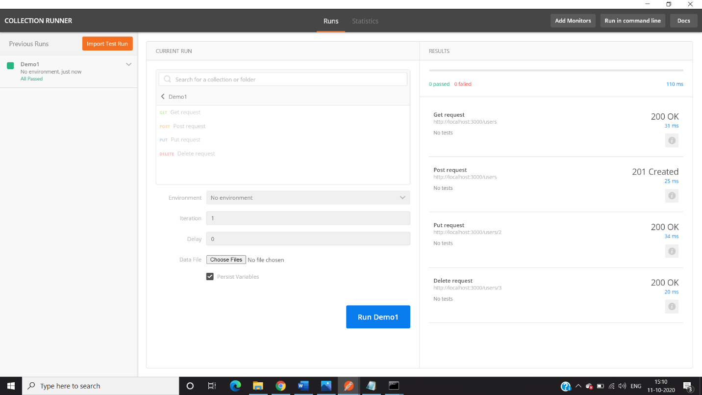 All the test cases are run simultaneously by using the runner option and providing the collection name which is demo3 in this case and clicks on run demo. After that, it will show the status codes regarding success or failure. In this way, the API’s can be created and tested using the Postman tool by using different HTTP methods and obtaining corresponding responses.