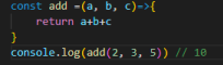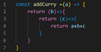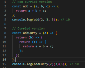 This second example shows how we used the same function but with a curried version that takes one argument and returns the function that takes another argument b, returns the function that takes another argument c, and that function returns its sum, which we have given. the same result as the first example: 10.