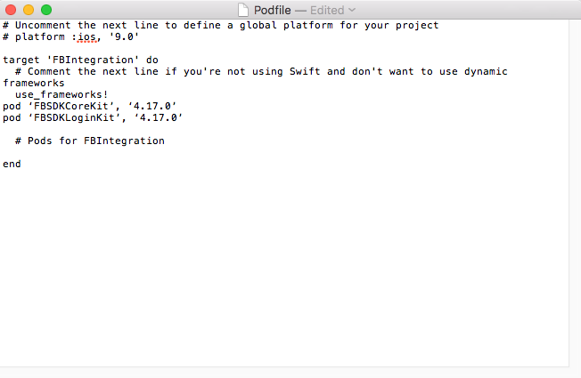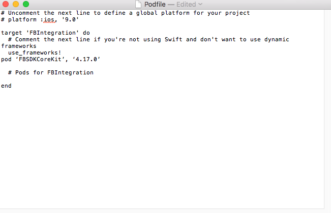 • Now open that Podfile and write pod ‘FBSDKCoreKit’, ‘4.17.0’ in the pod file you have just created above the line # Pods for FBIntegration.FbIntegration10