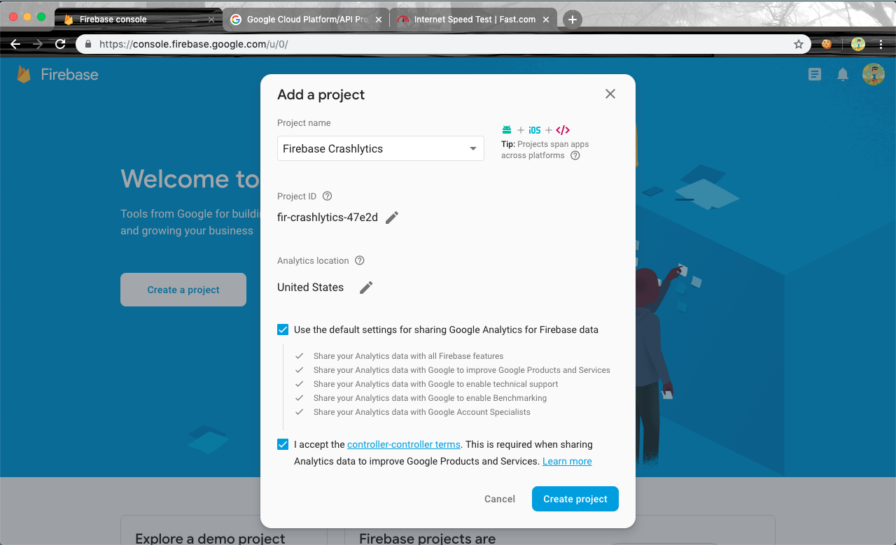 Step 4:- Now tap on ‘Create a Project’ button and create a new project, enter the name of a new Firebase project and accept terms & conditions and then tap on create the project. It will take some time to create a project. After the creation of the project click on continue.