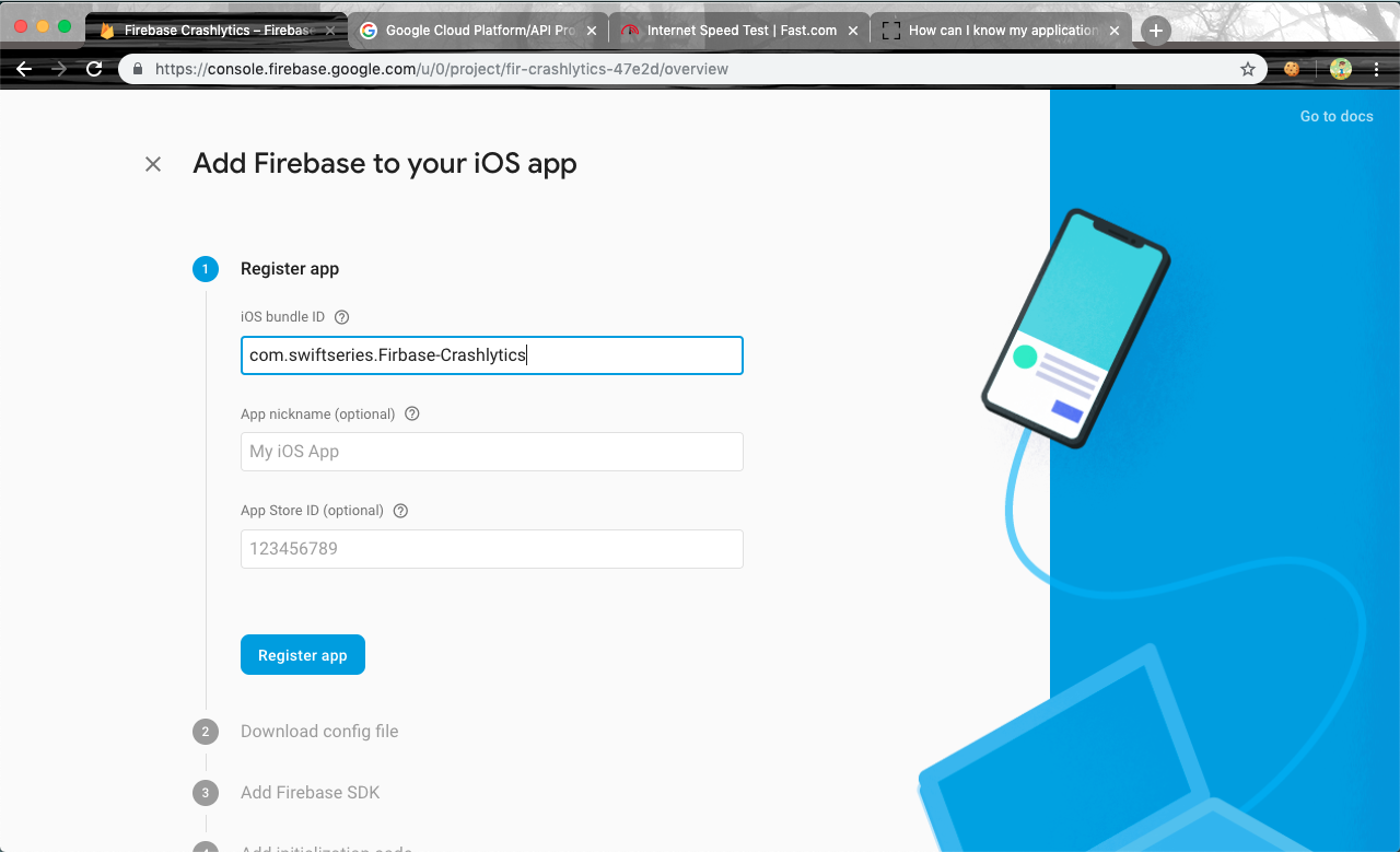 Step 6:- it will open a new form to register your Xcode project with firebase where you will have to enter your app details like iOS bundle Identifier (Then at the left select the top project item in the project navigator. Then select TARGETS -> General. Bundle Identifier is found under Identity ) etc. and Finally tap on register app.