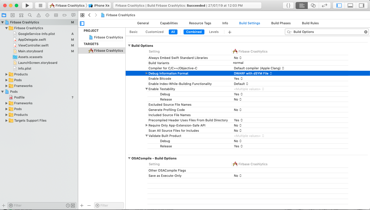Now under build options select “DWARF with dSYM File” as debug information format.