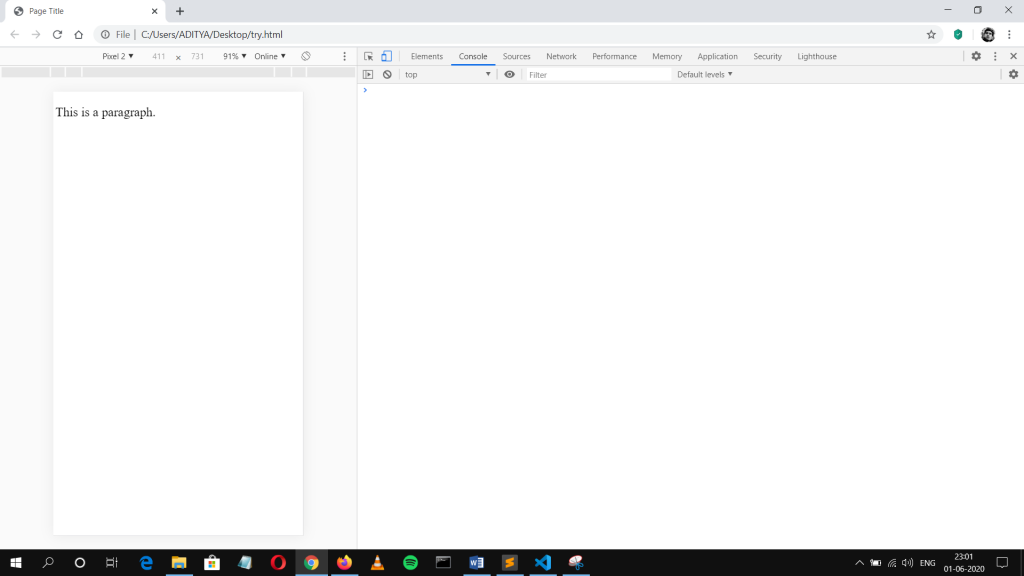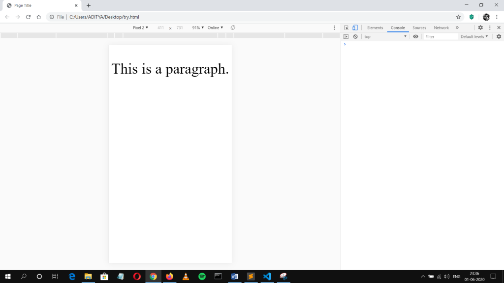 So first let’s clear some misconception from the minds of beginner Frontend Developers about testing responsiveness in browser. If Pixel is an absolute unit which means fixed then it should appear same throughout different devices of varied resolutions (total number of pixels). Here’s a code I’m using.