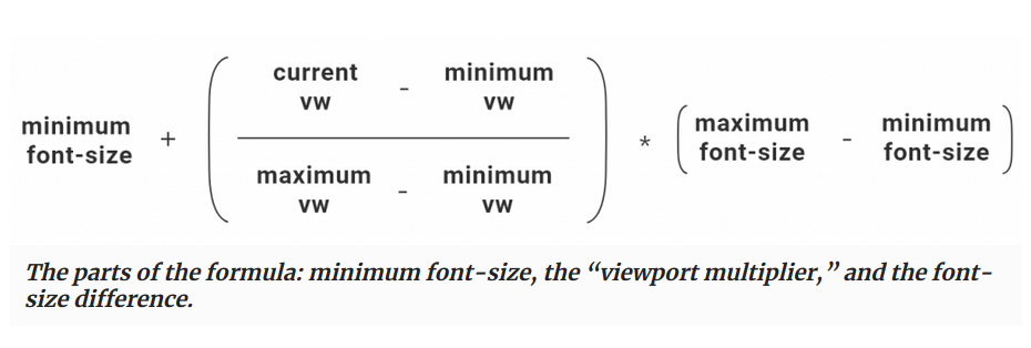 This formula might look complex in first sight, but it is very simple to understand and implement. And it is made complex just to have more control over the font-size for different viewport sizes in a smooth manner.