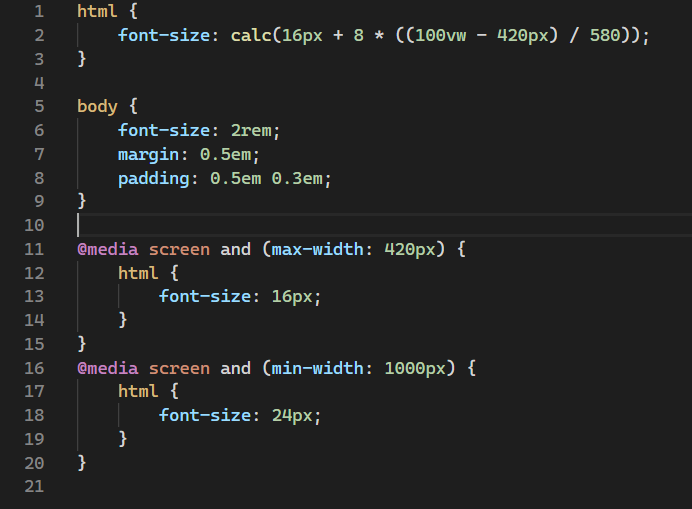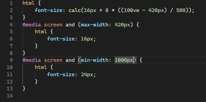 Suppose we want minimum font-size of 16px for viewport of 420px and maximum font-size of 24px for viewport of 1000px then that’s how CSS would look like.