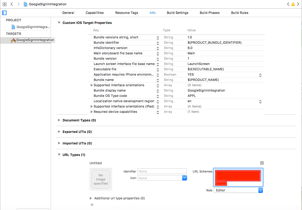 10. Now come to your Xcode project as you need to make changes here. In the Project > Target > Info. Open URL types below and paste Reverse client ID into url schemes column.