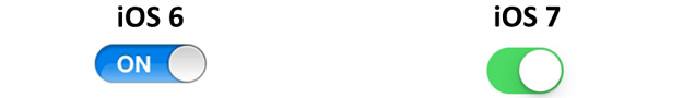 Switches – Switches in iOS 6 had texts in them. In iOS 7 its just simple solid color that indicates the switches status.