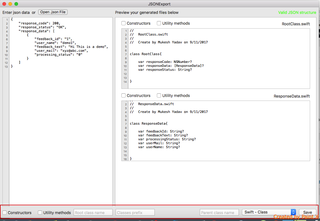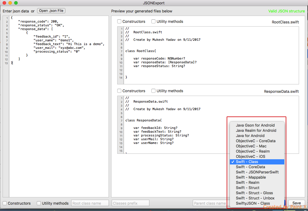 Here you can see your model in second window. It will name your class as property name and first class will be named as BaseClass. Here are some More option for you at bottom.