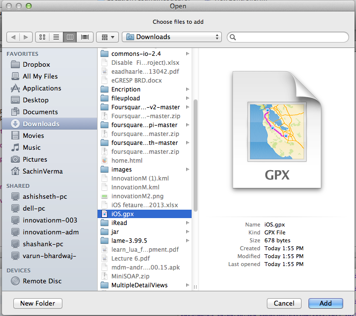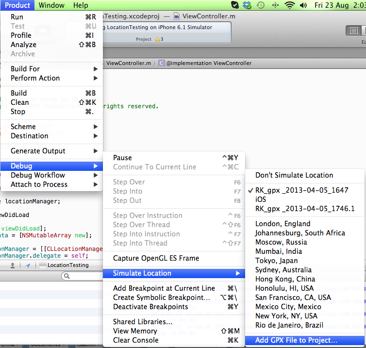 2. Run that generated in Simulator – Open up your xCode project, you can select Product -> Debug -> Simulate Location->Add GPX file from the menu bar to add GPX file to your project