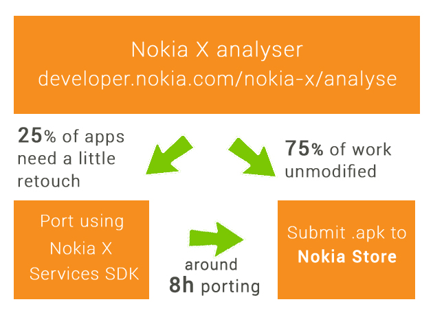 Most of the Android apps will run on Nokia X software platform without any modifications. We can check our APK’s compatibility by utilizing Nokia X analyser – http://developer.nokia.com/nokia-x/analyse/.
