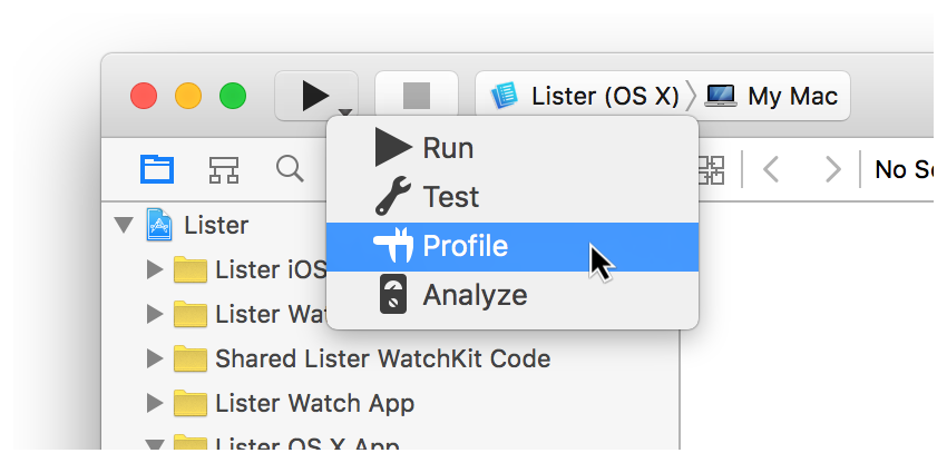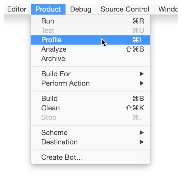 • Click and hold the Run button in the Xcode toolbar and choose Profile.
