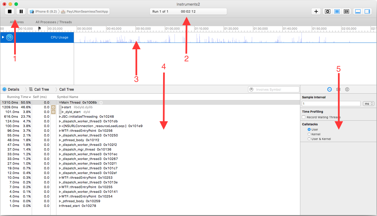 In Instruments tool, we can conduct testing under variety of conditions. We can also identify that how well the application uses the threads, cores and other resources. We can balance the work with multiple threads and offload work from main thread making our app more responsive. The Time Profiler instrument shows how well an application utilizes CPU cores and threads.