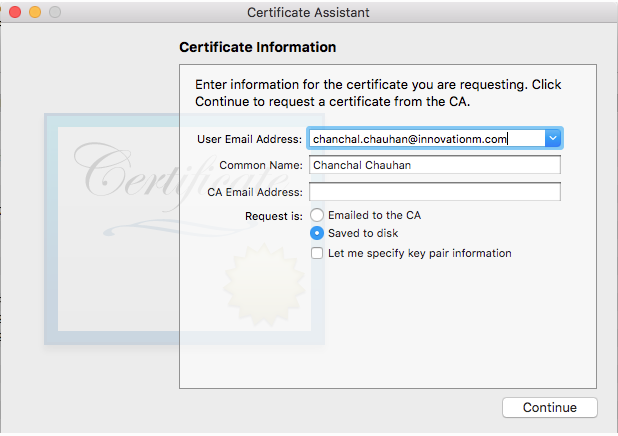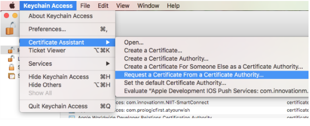 The Certificate Signing Request: Open the Keychain Access> Certificate Assistant> Request a Certificate From a Certificate Authority…