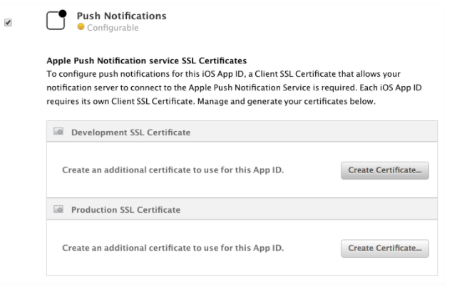 Now click on Edit and scroll down to Push Notifications section. Here are two sections which are used to create SSL Certificates for both the Development and Production stage. Click on first Create Certificate… button to create certificate for push notification for development.create_cert