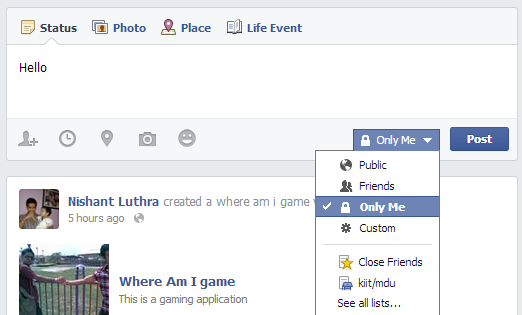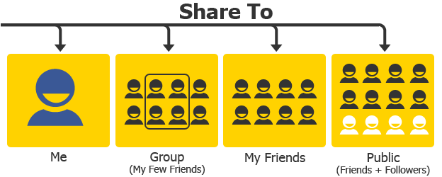 - If I post something then I can choose to whom it should appear (Me, Group, My All Friends, Public – Friends and Followers). It will appear in their Newsfeed and My Timeline
