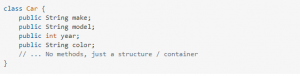 Let’s take an example of a simple object which is the car. The above image represents the way a car is defined which includes its model, year, and color.