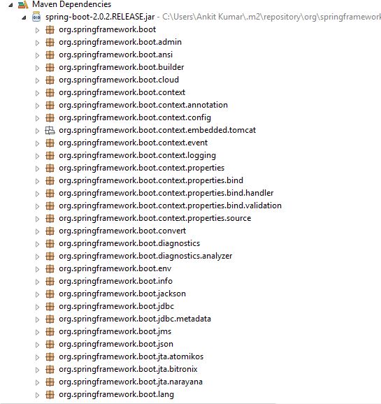 AutoConfigurationand will take care of all the internal dependencies that your application needs what you just need to do is just run your application. Spring boot will auto-configure with Dispatcher Servlet if Spring jar is in class path. It will auto-configue to datasource if hibernate jar is in class path. SpringBoot gives us a pre-configured set of Starter Projects to be added as a dependency in our project. - During web-application development, we would need the jars we want to use, which versions of jars to use and how to connect them together. All web application have similar needs. For example- Spring MVC, Jackson Databind , Hibernate core and Log4j (for logging). So, we had to choose the compatible versions of all these jars. In order to decrease the complexity , spring boot has introduced what we call Spring boot Starters