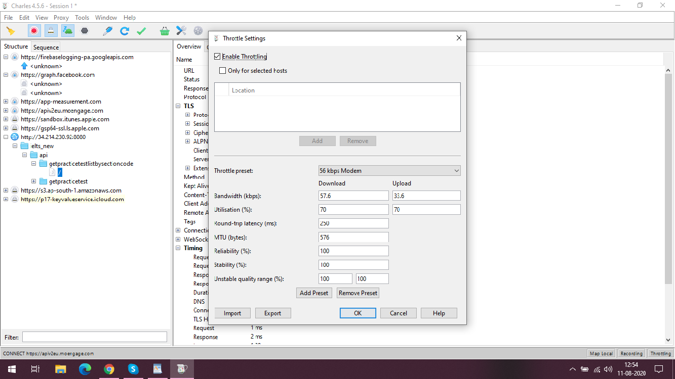 Throttling: Network throttling is to simulate different network bandwidth conditions like 2G, 3G, 4G, and WIFI. It can also be used to simulate customized modem network speeds.