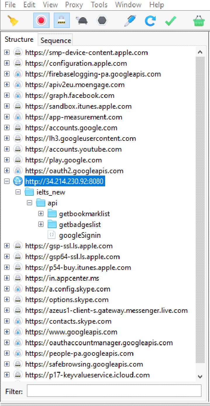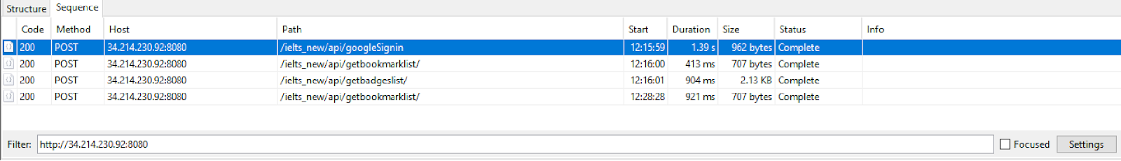 With the press of every button, if there’s any web service being called, it’ll record that in the history table. By default, structure view will be selected but the user can switch with sequence view. In sequence view filter can be put as to which calls to record. Simply put in the URL of the API or keyword distinguishing your app being tested calls.