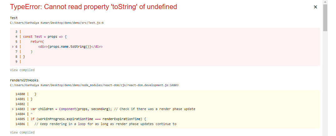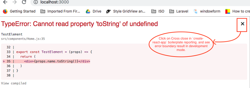 To see the actual error we have to close the create-react-app default reporting layout as shown below