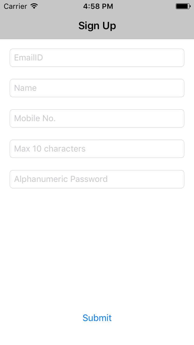 - On clicking Submit button after adding values to the textfields in the set of textfields for ex- signUpForm in our case, create an instance of validation model for ex- FormValidationModel and add values of the textfields to the model in your view Controller.